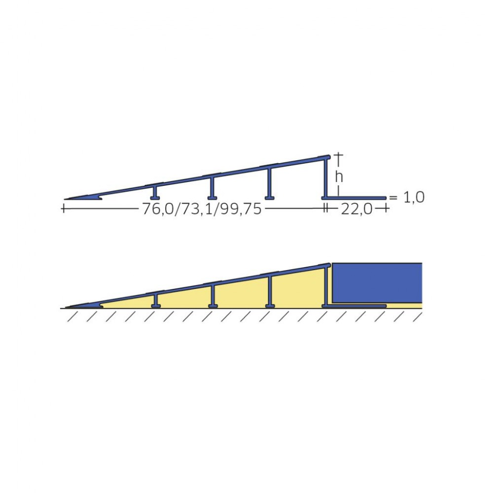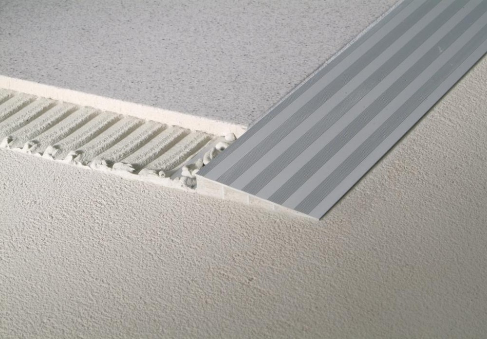 A Schlüter®-RENO-RAMP rámpa profil az erősen igénybevett burkolólapok, és a velük határos alacsony burkolóanyagok között biztosít lépcsőzetmentes átmenetet. A fugatávtartó orr előre meghatározza a padlólaphoz a fugakamrát.